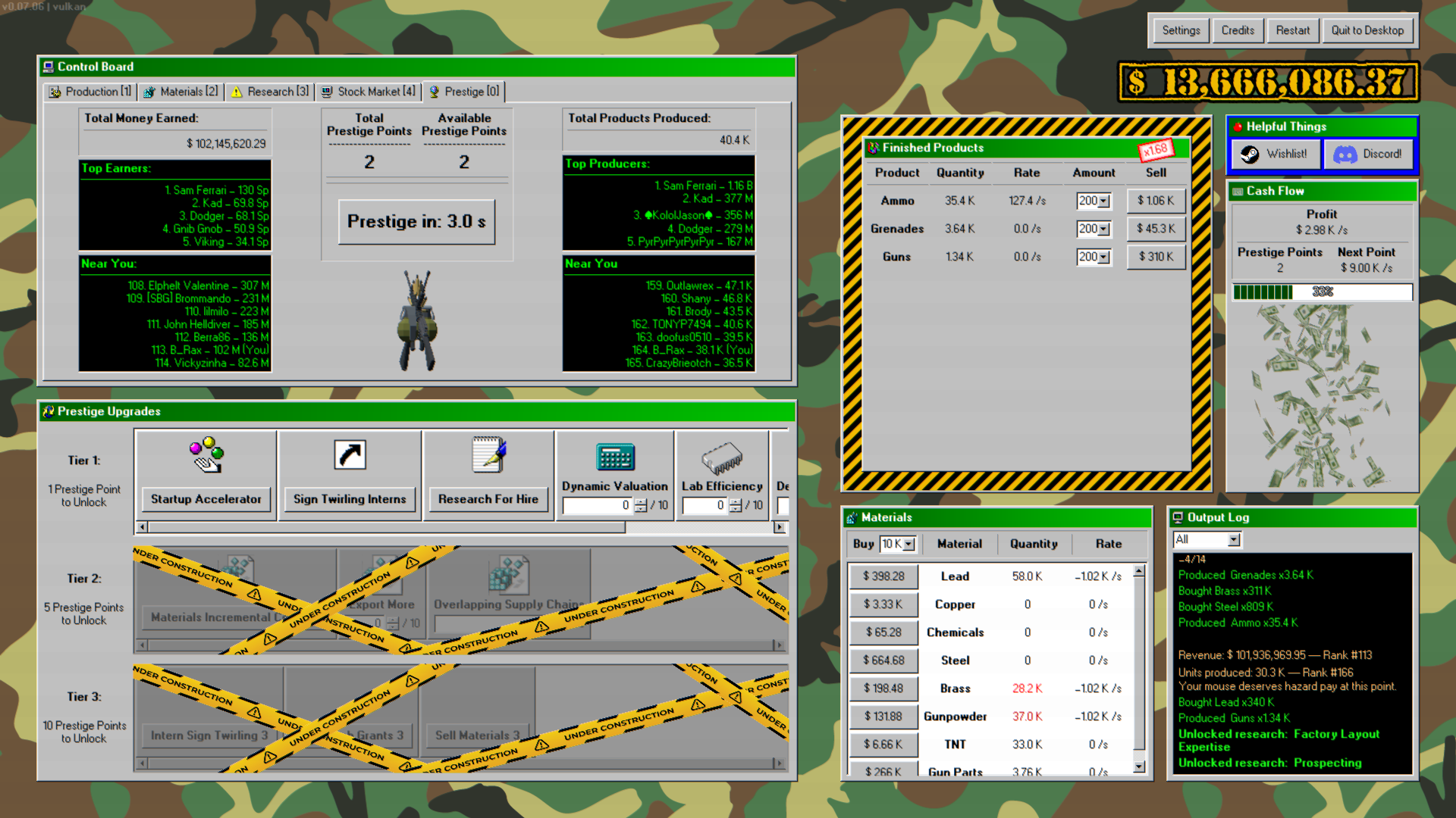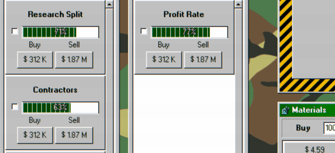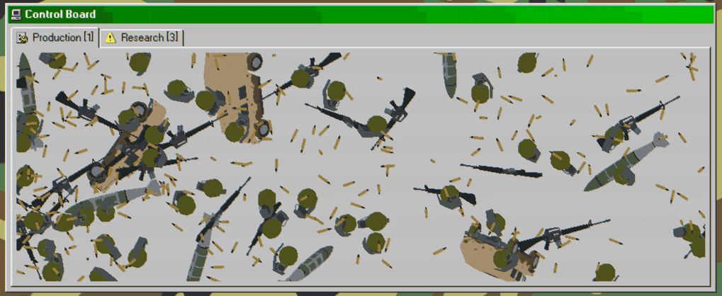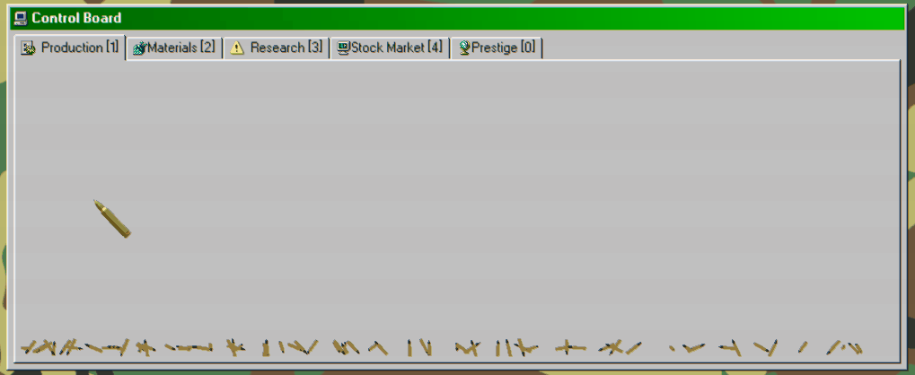 Make weapons, make money. An active incremental game where you amass as much money as you can by starting a Military Industrial Complex company. Produce multiple different weapons, research upgrades, manipulate the stock market, and lobby the government for favors.