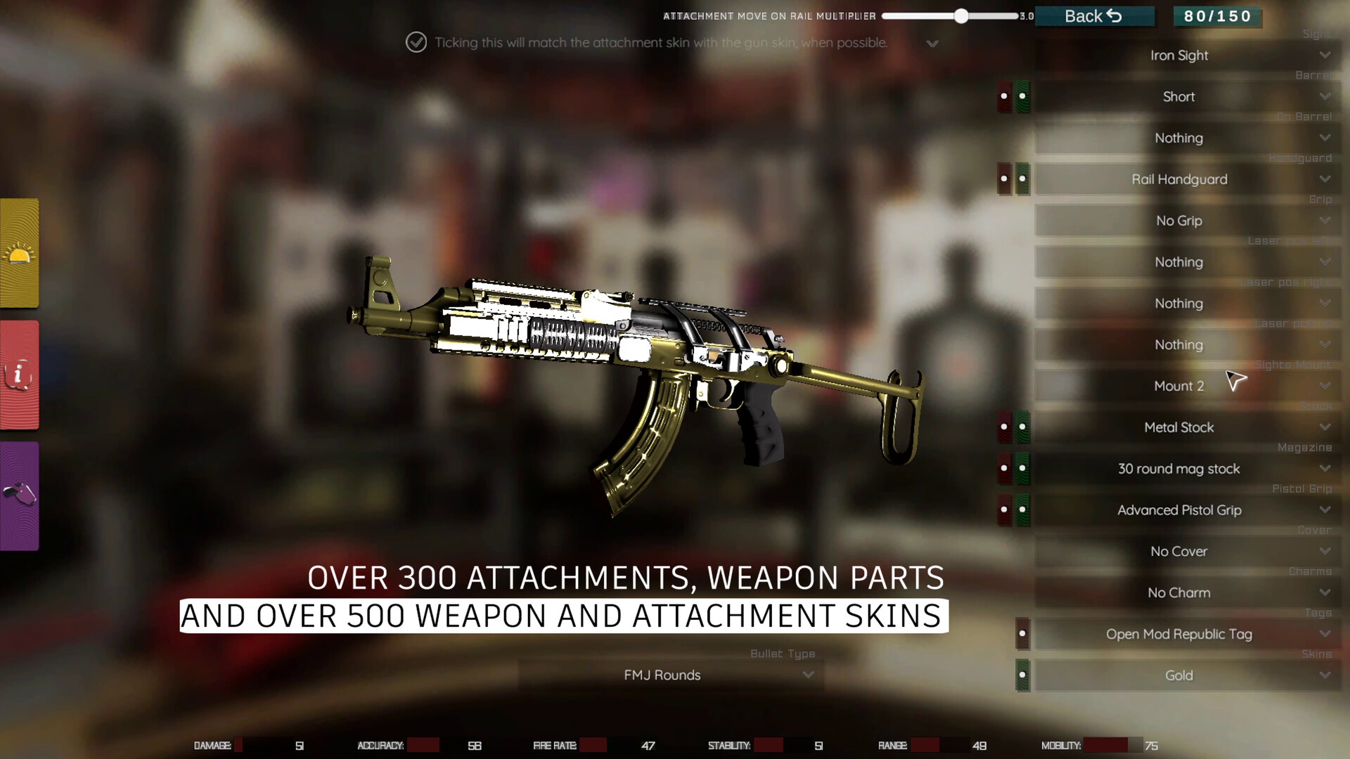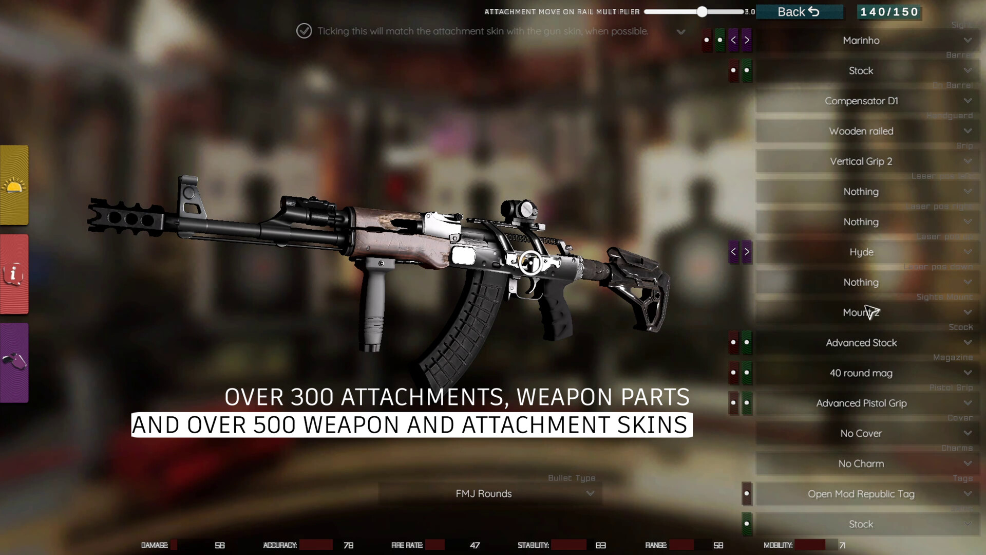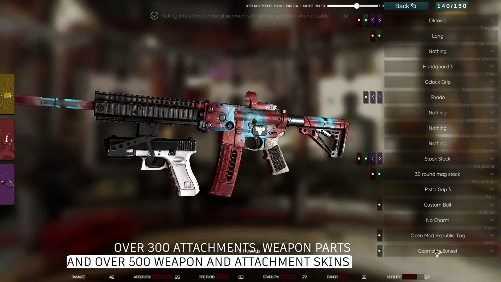 Open Mod has been built with scaling in mind, meaning that adding more content of all kinds into the game such as weapon skins, attachment skins, charms, tags, animations, even weaponery or custom maps, can be added in a matter of hours into the main game. Also our latest implementation of Unity's Addressables system allows us to have as much content into the game as we want, without having to load it all at the start of the game, but only when needed. With those said, we strongly believe we could add more content in time and at some point we could become the game with most customizability. We've already got 500+ skins available for a large variety of weapons and attachments, and 300+ attachments to choose from, plus individual weapon parts. Building content on top of this will eventually result in a highly populated with content game.