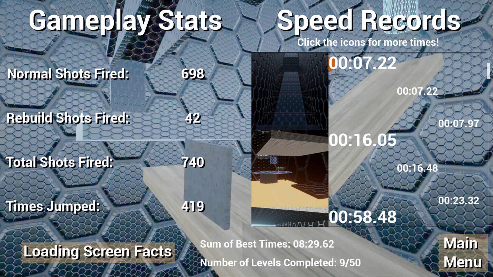 Every level tracks your time (but never compares it on a leaderboard, you can post it on Reddit if you're into that)! The main menu keeps a tally of ALL your best times for every level! If you make a mistake, use the quick restart hotkeys and be back in in seconds!