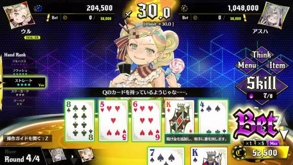 Additionally, you can hustle the gamblers around town to rake in quick cash, or go on a winning streak in “Poker Royale”—which rewards you after achieving a set number of victories—to earn the points needed for acquiring new skills and to obtain rare items, thereby increasing your standing as a gambler.