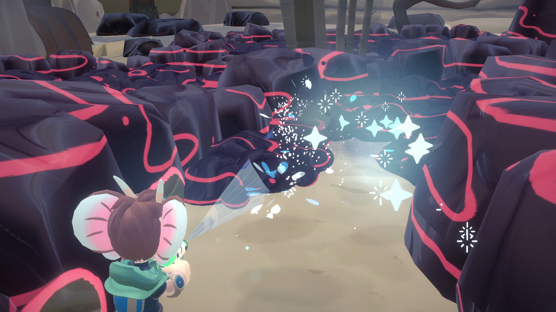 As you clean the world you will see the color return to the once very grey beach in a highly satisfying way. When you have cleared the pillar, the shell, or the pond, its whole surrounding area is restored and a lily pad will emerge to help create your path to the cliff outlook. Now, get to work fellow Muri!