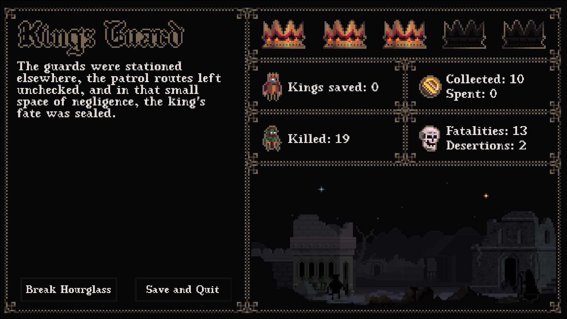 In this turn-based strategy roguelike your job is to keep an ungrateful king alive. As the royal guard's manager you unlock upgrades, assign badges for special skills and try to keep morale and supplies from collapsing faster than the monarchy.