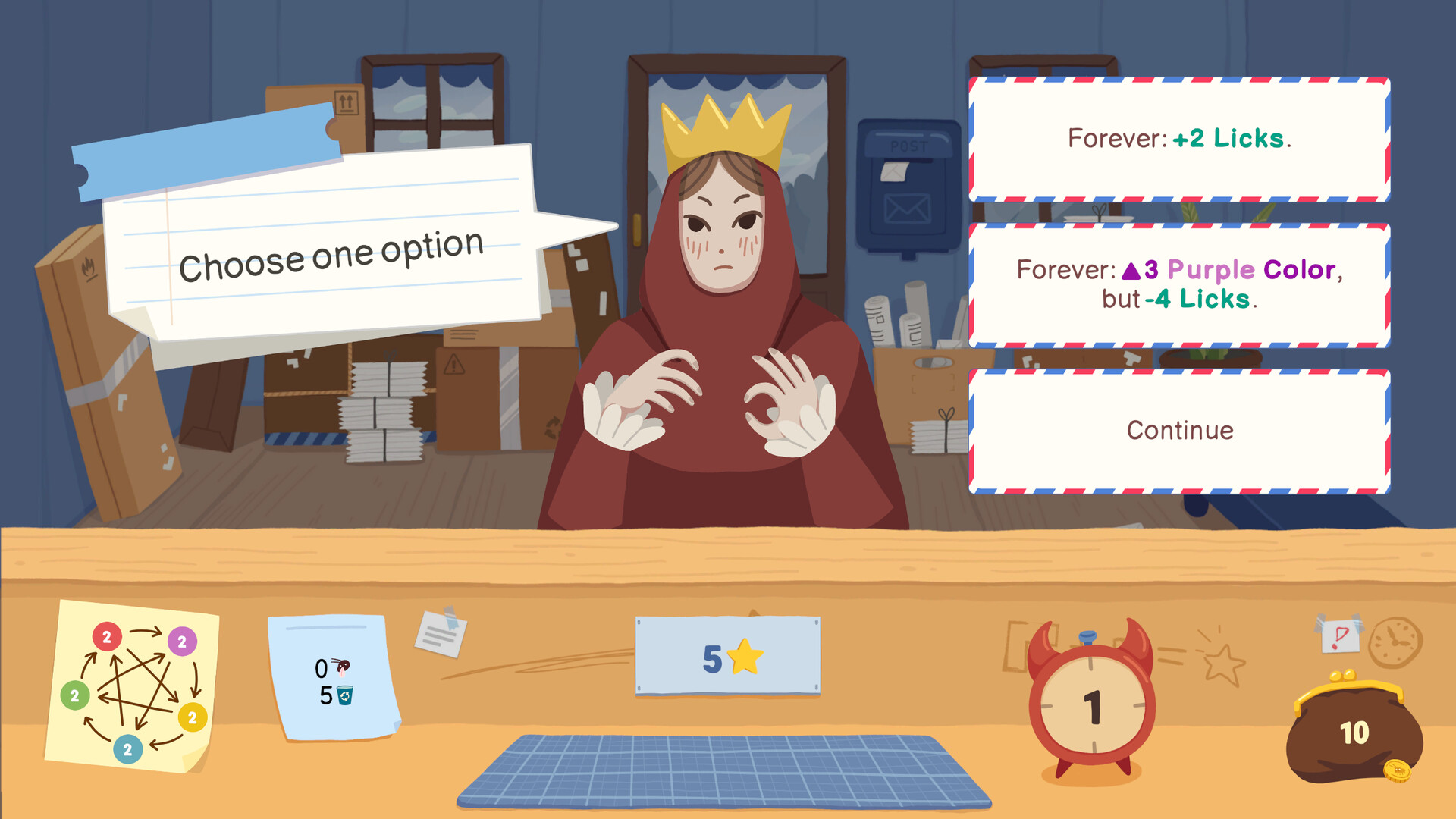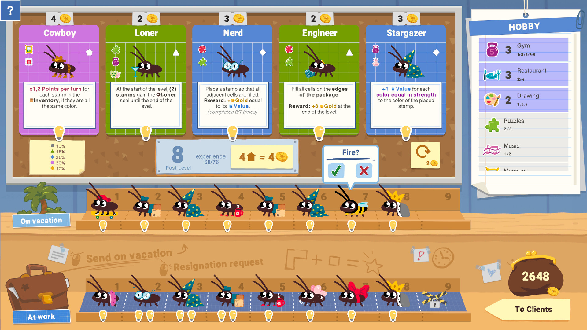 Before each run, you choose which stamps and cockroach workers to bring with you. Build your own strategy!
