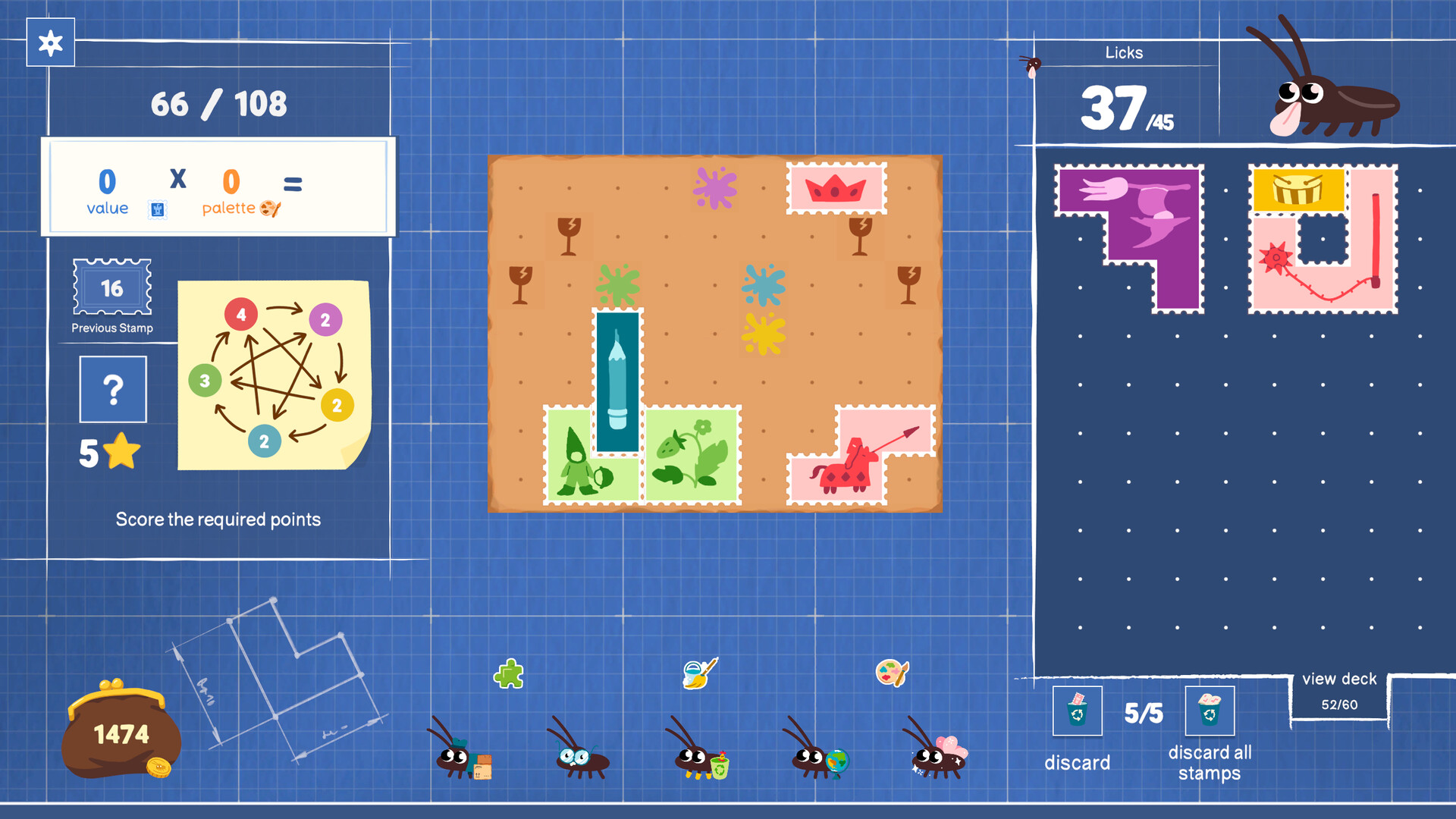 Stamps aren't just colorful — their colors affect each other, boosting or weakening your score depending on the combinations.