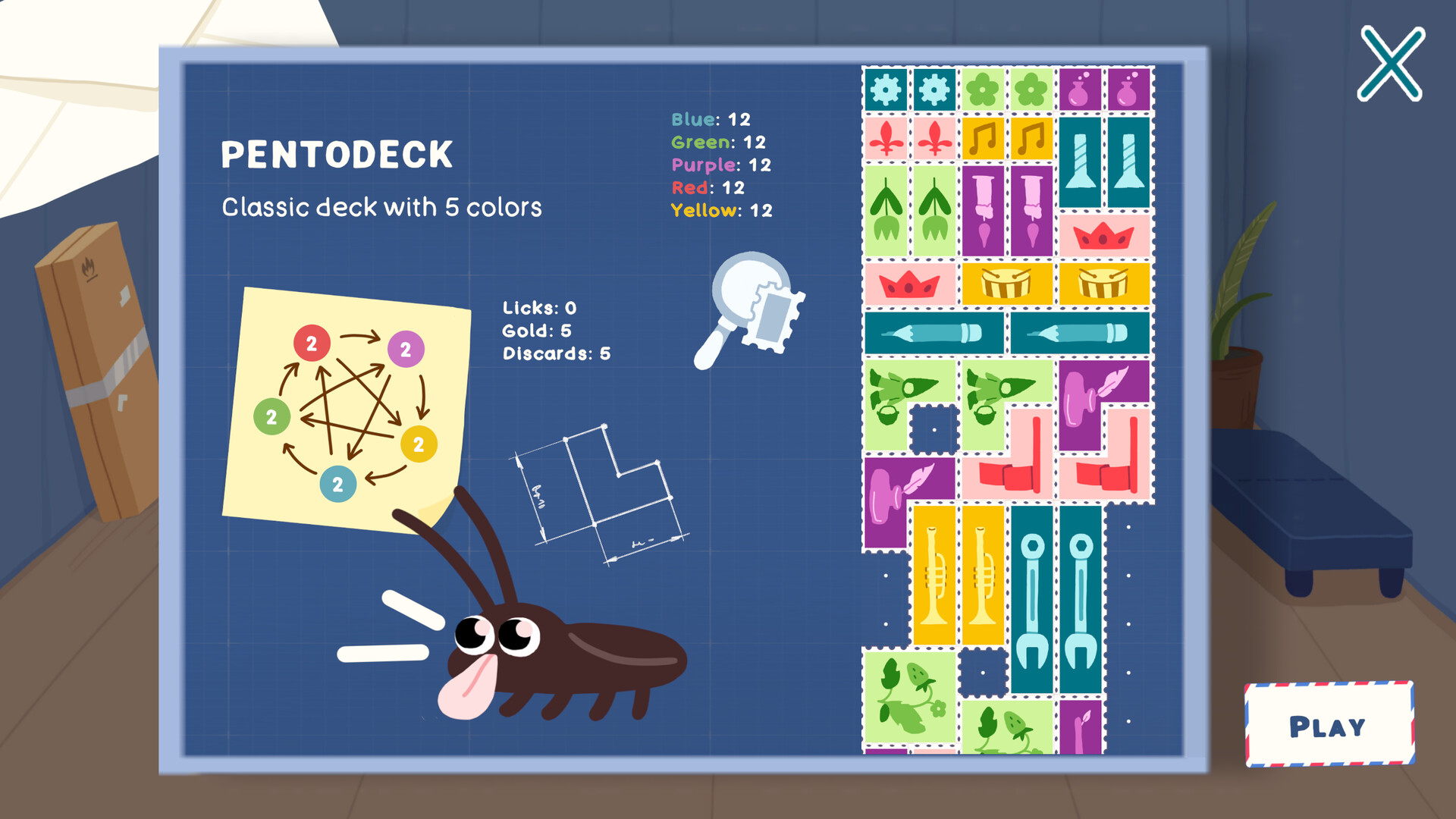 Roach Post is a roguelike puzzle game where you place polyomino stamps to teleport packages. Combine shapes, colors, and roach worker effects, build your deck, gather power — and make sure every delivery gets through!