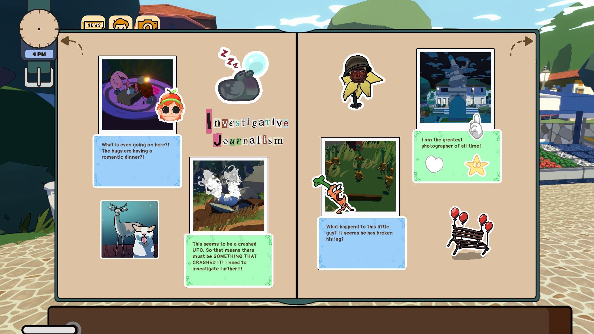 Unlock stickers by photographing weird moments, completing quests, and exploring hidden areas. Use the stickers to decorate your journal to reflect your creativity, turning it into a masterpiece or an evidence board. It’s all up to you!