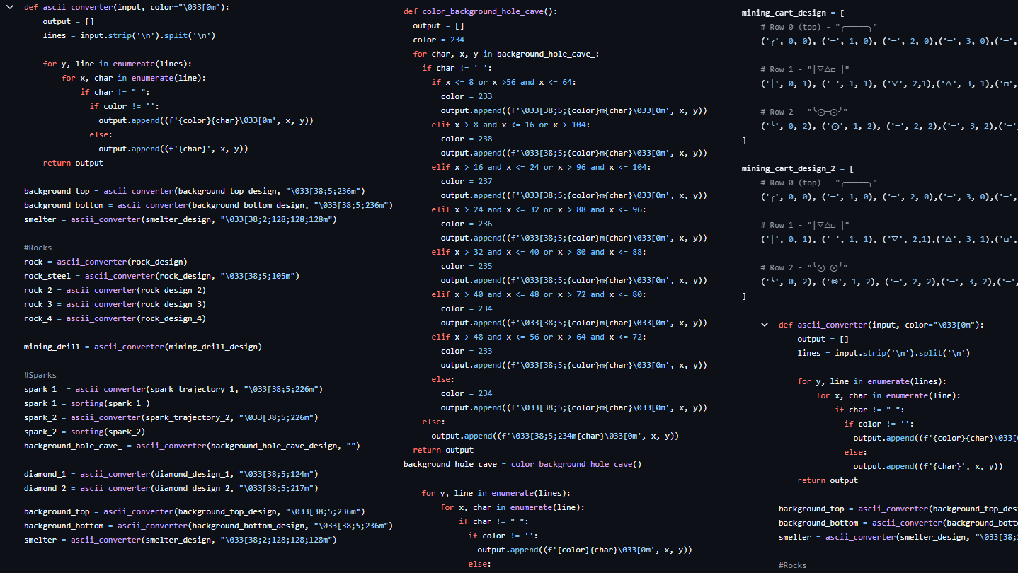 A terminal-based incremental mining game with ASCII graphics and hybrid idle/active gameplay.